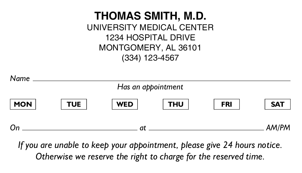 MediScripts now offers appointment cards. Get a box of personalized appointment cards delivered to your practice within one week. Our appointment cards are produced on high quality paper in our state-of-the-art digital production facility. Medi Appointment Cards come in black and white, standard business card size (3½"x 2") with 4 template style options to choose from. Appointment cards are personalized with your business name, address, contact information and space for all of your patients' appointment details.